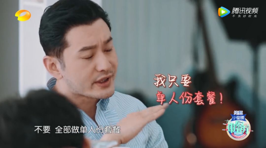 同样是这一集,黄晓明临时提出要做单人份套餐,取代让客人自由点菜的模式,而套餐中包括从前菜到主食到甜品等五道菜。